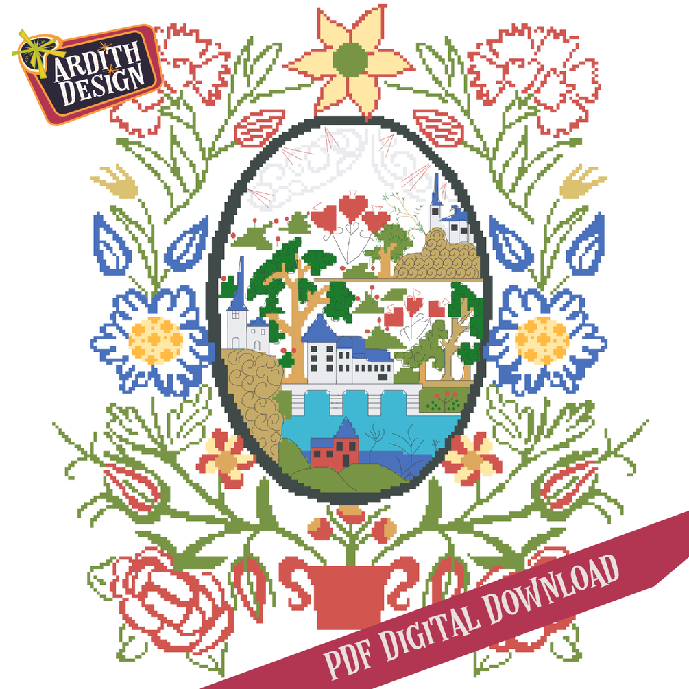 This is a lovely large counted cross stitch pattern charted from an 18th century French Valentine. The pattern features a large floral border of carnation flowers and roses. The center motif inside the oval features a whimsical medieval village with heart trees and an aqueduct.